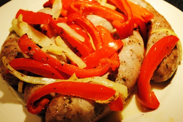 Take a glass cooking dish and line it with aluminum foil. Cut both the pepper and onion in 1/2″ slices. Pour a bit of olive oil in the dish then place the sausages, this will help them not stick to the foil. Cover the sausages with the cut onions and peppers. Drizzle a bit more olive oil and sprinkle some oregano. Cook in the over at 400 F for about 40 minutes. Once ready, place the sausages, onions and peppers on a serving plate, squeeze some lemon juice over, serve and enjoy! Happy Cookin!